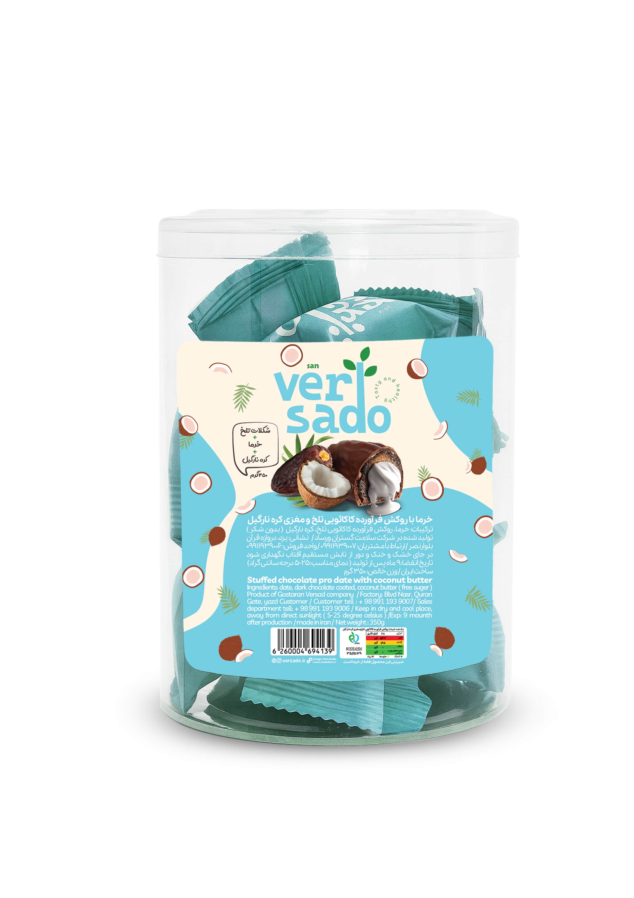 خرما با مغزی کره نارگیل رژیمی و بدون شکر با روکش شکلات تلخ 85درصد